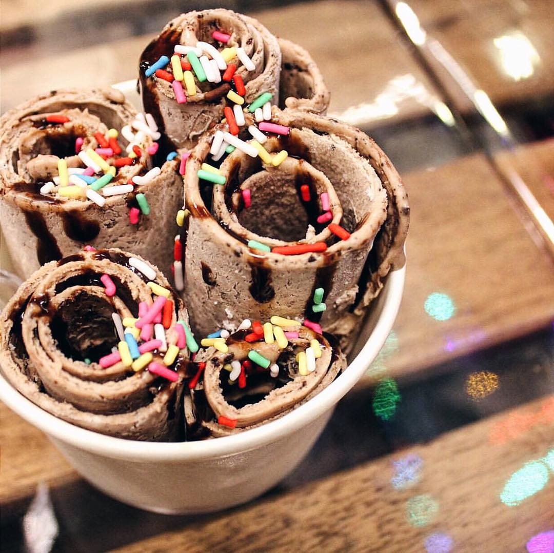 Изначально готовится масса для мороженого. Далее она наносится на специальную поверхность фризера. При этом важно распределить сырье равномерно на поверхности. При этом мороженое начинает быстро застывать. На эт может потребоваться какое-то время. Далее шеф-повар аккуратно сворачивает блинчик в ролл и добавляет дополнительные ингредиенты для придания десерту более изысканного вкуса.