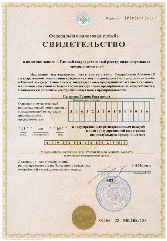Кстати, помимо свидетельства о регистрации ИП вам будет выслано или выдано непосредственно на руки свидетельство о внесении в ЕГРИП по форме №60004, а также выписка из этого реестра.