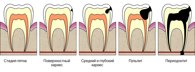 Кариес является самым распространенным заболеванием зубов. Именно с его лечением ежедневно приходится сталкиваться врачам - стоматологам. Поражает данное заболевание преимущественно эмаль и твердые ткани. Если кариес не лечить, то в ближайшее время разрушение затронет «живую» часть зуба пульпу и разовьется пульпит. Если не лечить кариес, а тем более пульпит, то можно потерять зуб. Самый распространенный способ восстановления потерянного зуба - это имплантация зубов. Этапы развития кариесаДля контроля за состоянием полости рта необходимо посещать стоматолога раз в 6 месяцев. Считается, что этого достаточно, чтобы своевременно заметить изменения в ткани зуба и начать лечение. Ранняя диагностика кариеса позволяет обойтись без использования бормашины. При визуальном осмотре стоматолог может заметить на поверхности эмали пятна ярко белого цвета, которые сигнализируют о том, что в этом месте происходит развитие бактерий. Чтобы не допустить прогрессирования кариеса в этой стадии, стоматолог полирует эмаль зуба, а затем обрабатывает ее пастами, содержащими повышенное количество кальция. При поверхностной стадии кариеса, которая, кстати, встречается чаще предыдущей, наблюдается полное разрушение эмали. В этом случае не удается обойтись без пломбировочного материала, но работы по лечению заболевания бывают минимальными.