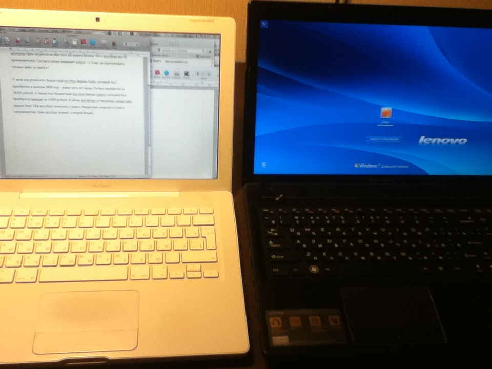 У меня под рукой есть бюджетный ноутбук фирмы Apple, который был приобретен в далеком 2008 году - ровно пять лет назад. Он был приобретен за 36500 рублей. А также есть бюджетный ноутбук фирмы Lenovo, который был приобретен намедни за 21000 рублей. В обоих ноутбуках установлены процессоры фирмы Intel. Оба ноутбука относятся к классу бюджетных моделей от своего производителя. Один ноутбук черный, а второй белый. На одном ноутбуке стоит операционная система MacOS, на втором MS Windows.