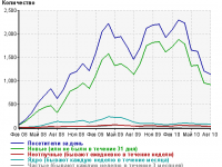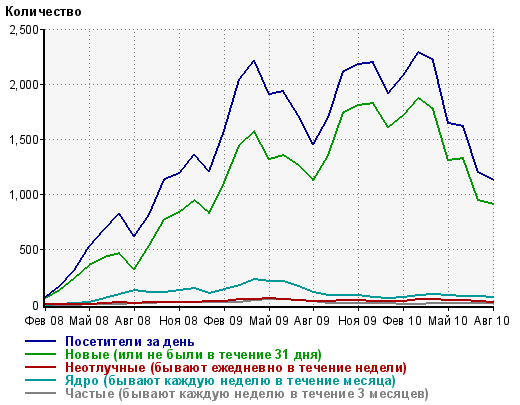 На графике к статье приложены показания посещаемости одного крупного конкурирующего сайта. Сайт динамично развивался и достиг 200 тысяч показов в месяц. Солидная цифра - как не крути. Но основатели на сайтик забили, стали публиковаться там чуть ли не раз в неделю (что довольно-таки мало). В итоге - график посещаемости резко упал.