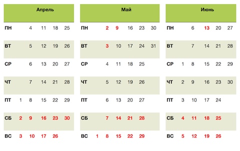 Производственный календарь и норма рабочего времени на 2 квартал 2016: