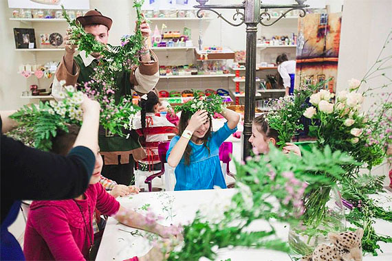 Самое необычное (если не считать то, что здесь есть балетный класс) — это творческая мастерская. По стенам расставлены стеллажи с готовыми поделками и расходными материалами: несколько десятков видов парафина, воска и формочек для свечей; шкатулки и фигурки для росписи, картон и цветная бумага, краски, пластилин, кофейные зерна и цветные макароны, кисти, трафареты, блестки, нитки — глаза разбегаются не только у детей.