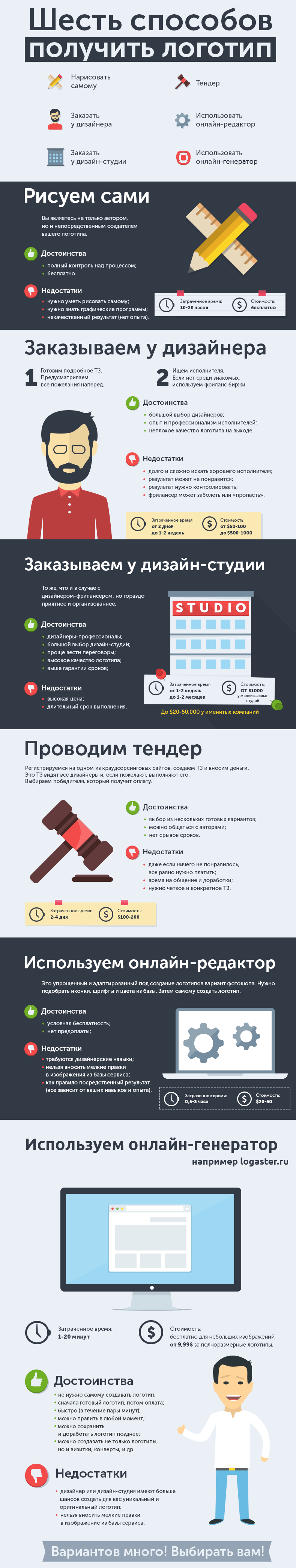 Перед тем как открыть свою фирму нужно решить множество организационных проблем. Одна из них это как сделать фирму и её продукцию популярной и узнаваемой. Самый эффективный способ решения этой проблемы – создать логотип. Логотип один из главных компонентов фирменного стиля, потому что на него, прежде всего, обращают внимание клиенты, которые интересуются фирмой или её продукцией. Он делает фирму более деловой и ответственной в глазах клиента, повышает его доверие. Поэтому всем деловым людям нужно понимать, где и как его получить. Есть 6 главных вариантов создания логотипа, характеристика которых изложена в данной инфографике.