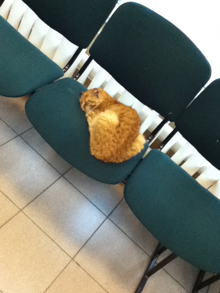 Ещё в Сбербанке лежал рыжий кот. Говорят, рыжий - значит счастливый. Не знаю, это новый атрибут банка или просто случайный гость. Но выглядело это интересно - однозначно. Лежит такой кот на лавочке. И спит.