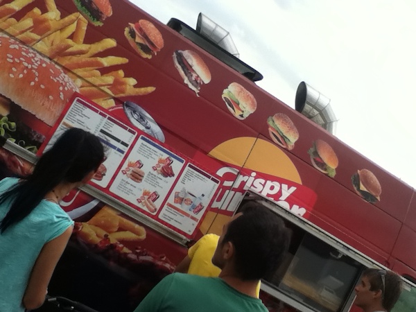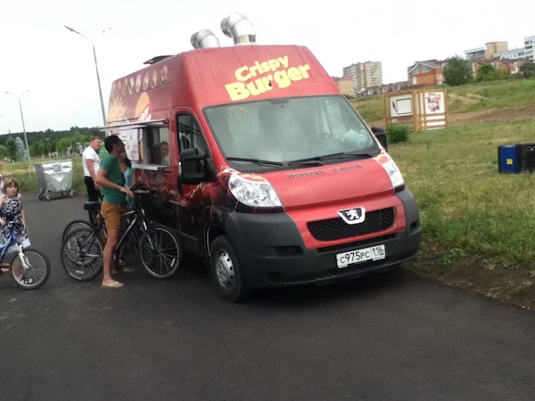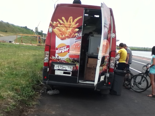 Одним словом - речь идёт об обычной Газели, но переделанной под кухню на колесах. Здесь, сбоку развернута импровизированная касса и место, куда должны выстраиваться люди в очередь за вашими сосисками в тесте, минеральной водой и так далее.